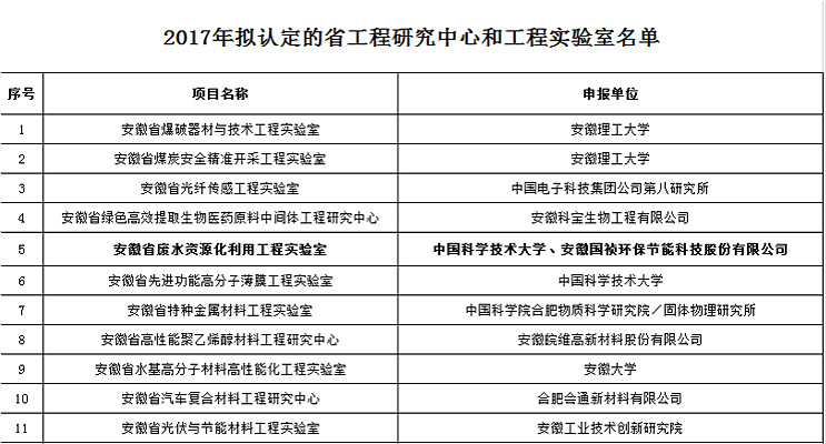近日,安徽省發(fā)展與改革委員會(huì)發(fā)布了《2017年擬認(rèn)定的省工程研究中心和工程實(shí)驗(yàn)室名單》,國(guó)禎環(huán)保與中國(guó)科學(xué)技術(shù)大學(xué)共建的“安徽省廢水資源化利用工程實(shí)驗(yàn)室”成功獲批。
