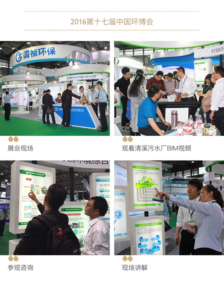 此次展會(huì),國禎環(huán)保全方位地展示了公司業(yè)務(wù)領(lǐng)域和標(biāo)志性事件,四大主題展區(qū)著重推介了公司的四種業(yè)務(wù)解決方案和相關(guān)案例,分別是類IV類水標(biāo)準(zhǔn)核心技術(shù)解決方案及案例、全地埋式污水處理廠PPP項(xiàng)目技術(shù)方案及案例、水環(huán)境綜合治理解決方案及案例、村鎮(zhèn)環(huán)境綜合整治解決方案及案例等,吸引了大量參展觀眾和業(yè)內(nèi)人士前來參觀咨詢,獲得了高度關(guān)注和好評(píng)。其中,我司展出的村鎮(zhèn)環(huán)境綜合整治解決方案和黑臭水體治理解決方案是參展觀眾的咨詢熱點(diǎn),我司各事業(yè)部負(fù)責(zé)人從專業(yè)角度與觀眾進(jìn)行深度交流、溝通、洽談?,F(xiàn)場(chǎng)還吸引了海外人士和媒體的關(guān)注,與國際友人進(jìn)行了業(yè)務(wù)交流溝通,中國環(huán)保在線高端訪談對(duì)我司進(jìn)行了現(xiàn)場(chǎng)采訪和報(bào)道。