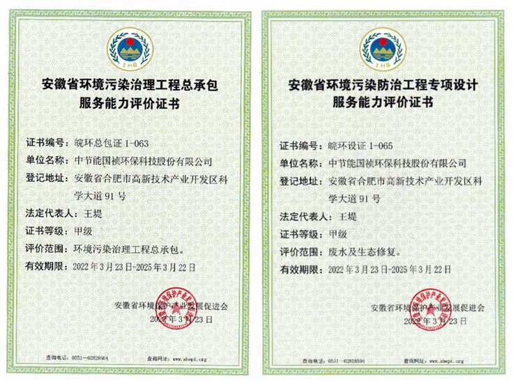 3月23日,經(jīng)過前期材料準(zhǔn)備、專家評審及實(shí)地考察,中節(jié)能國禎獲得安徽省環(huán)境保護(hù)產(chǎn)業(yè)發(fā)展促進(jìn)會頒發(fā)的《安徽省環(huán)境污染治理工程總承包服務(wù)能力評價(jià)證書(環(huán)境污染治理工程總承包甲級)》、《安徽省環(huán)境污染防治工程專項(xiàng)設(shè)計(jì)服務(wù)能力評價(jià)證書(廢水及生態(tài)修復(fù)甲級)》兩項(xiàng)證書。